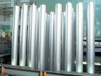將合金鋁澆進鑄模內(nèi)后急速冷卻,液體凝固后形成圓柱狀的鋁棒。照片中是被吊起的、長達6米的鋁棒。
